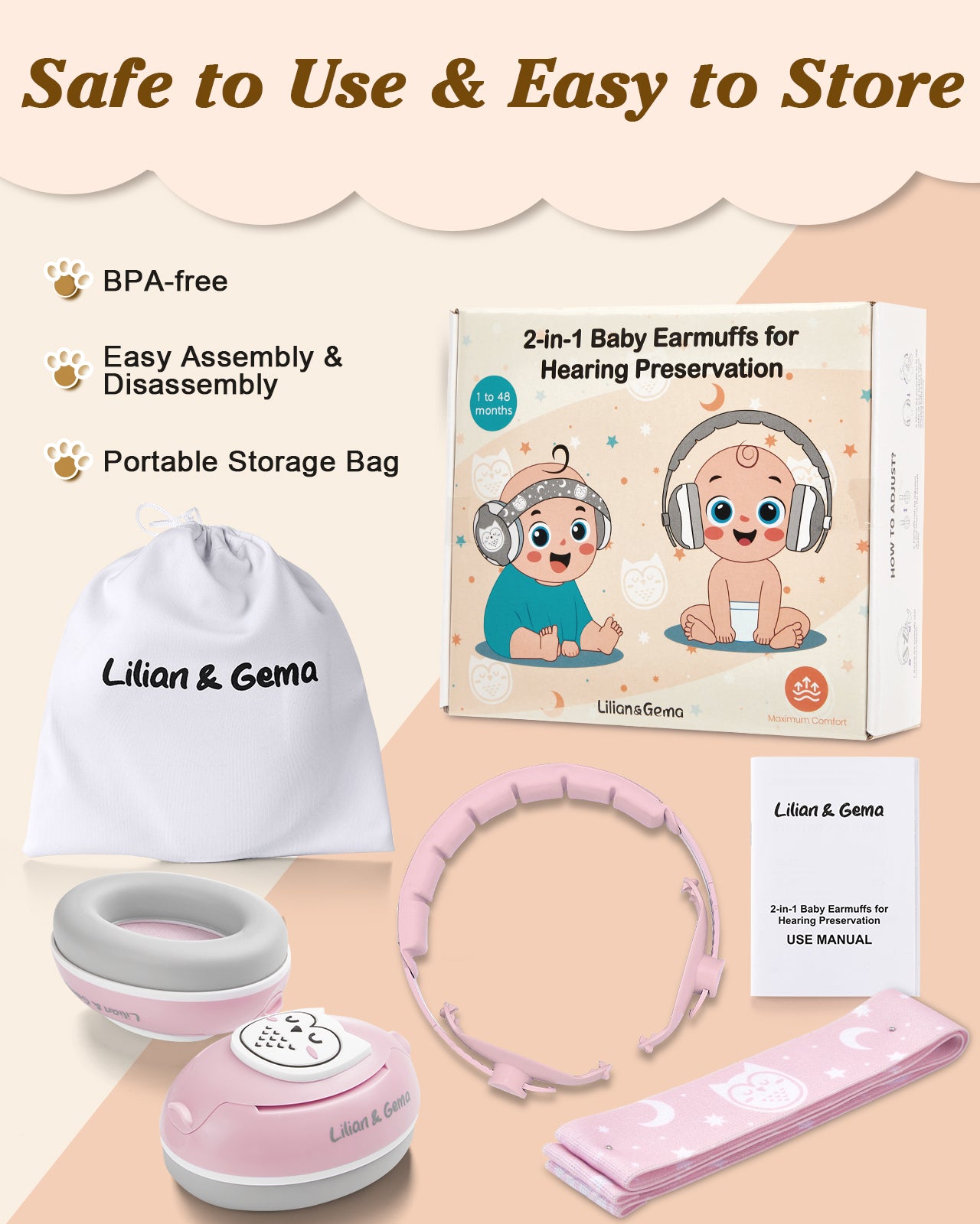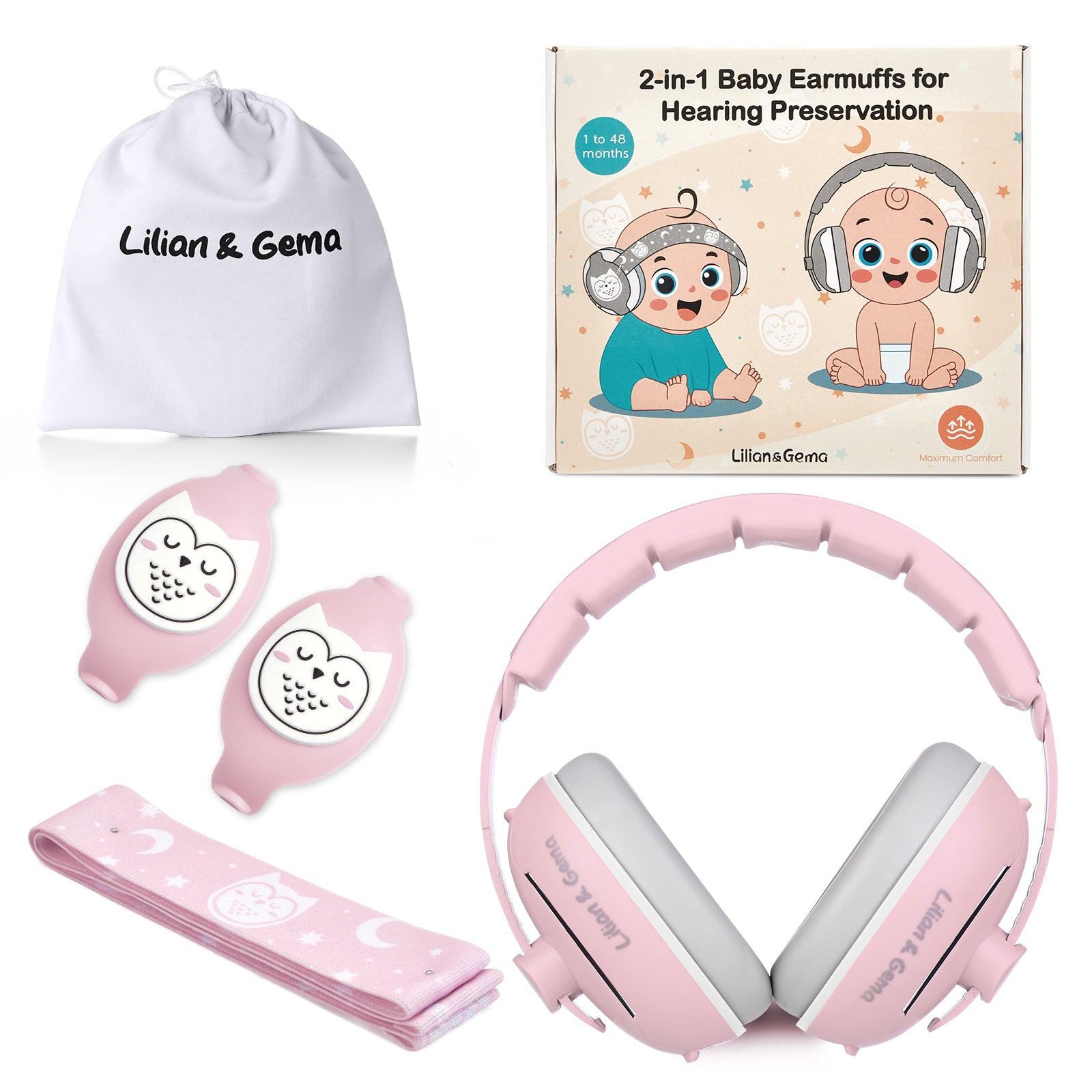 Lilian&Gema 2-in-1 Baby Ear Muffs Noise Protection, Adjustable Baby Headphones with Band, Owls Noise Cancelling Headphones for Baby & Toddler up to 4 Years, Baby Airplane Essentials/Outdoor, Pink