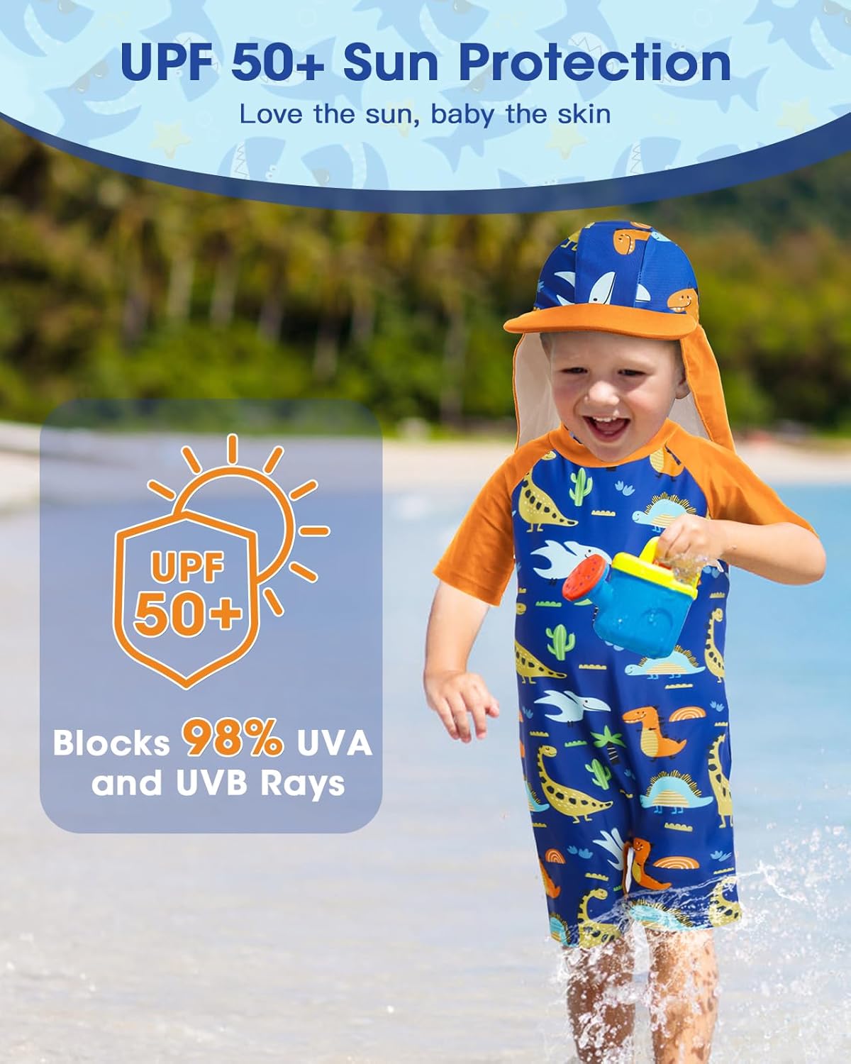 Lilian&Gema Toddler Boy Swimsuit UPF 50+ Protection One Piece Zipper Bathing Suit Baby Swimsuit with Adjustable Sun Hat